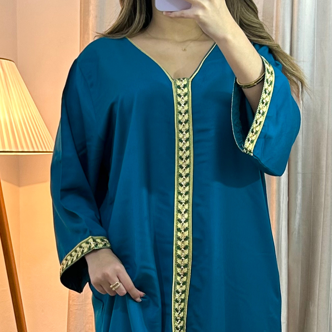 🌸 أناقة ناعمة وتفاصيل راقية – جبة مصنوعة من قماش مْليفة (فيسكوز + كتان)، خفيف وسهل اللبس. مزينة شريط مزخرف رقيق وخيط خفيف على الياقة والأكمام تضيف لمسة أنثوية ناعمة ومميزة.