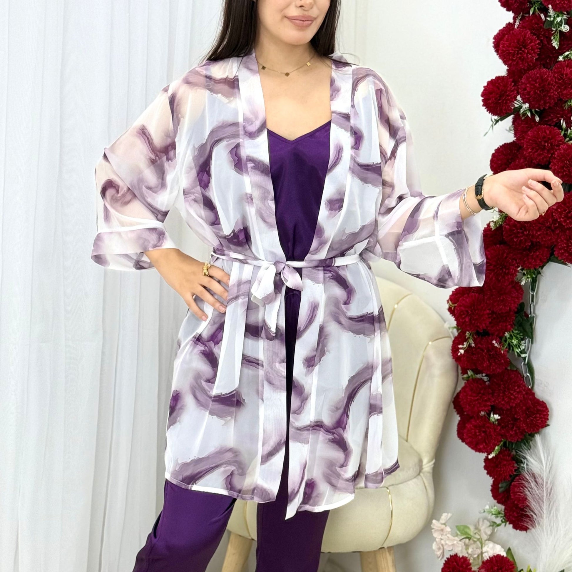 - ✔️ طقم من 3 قطع: توب + سروال + كيمونو