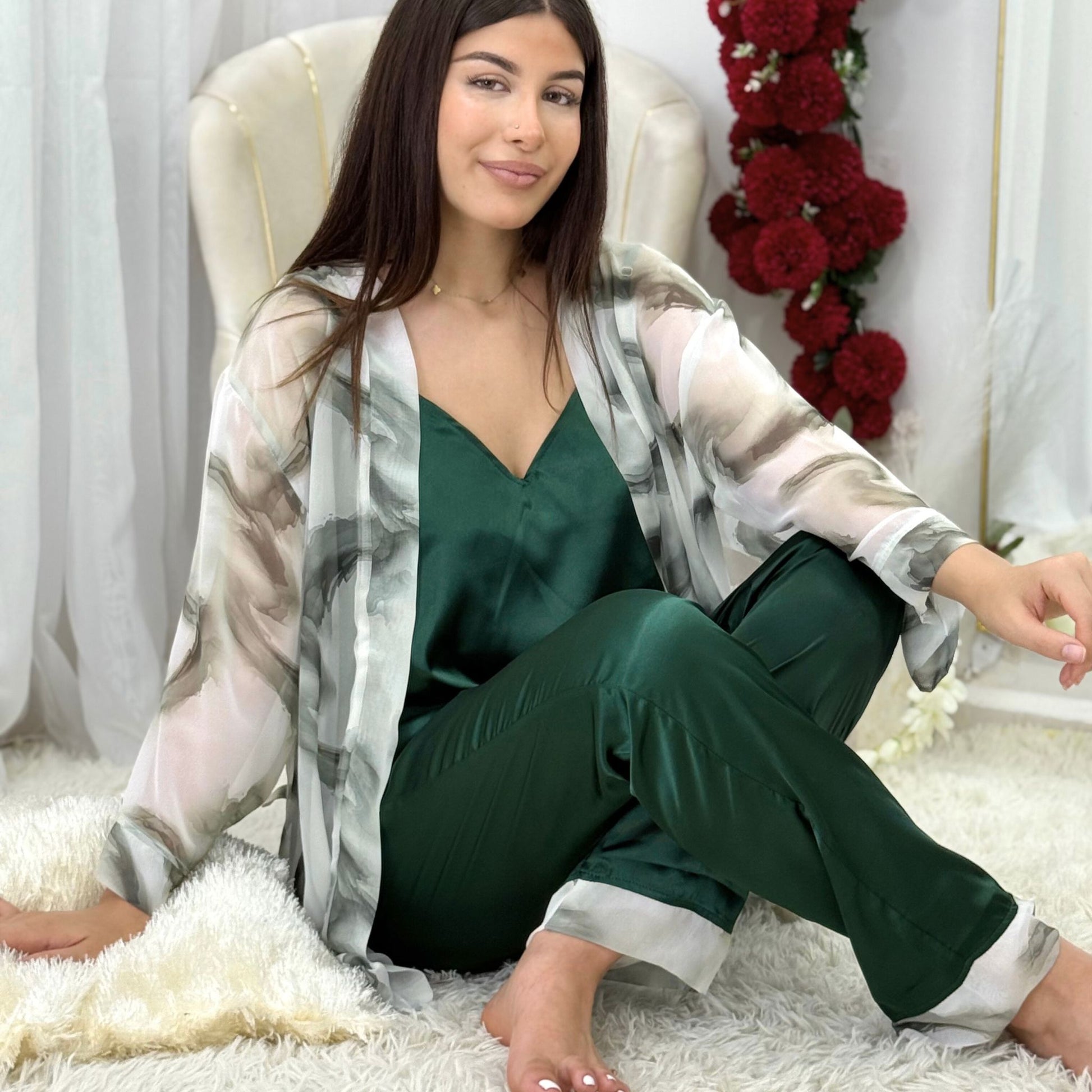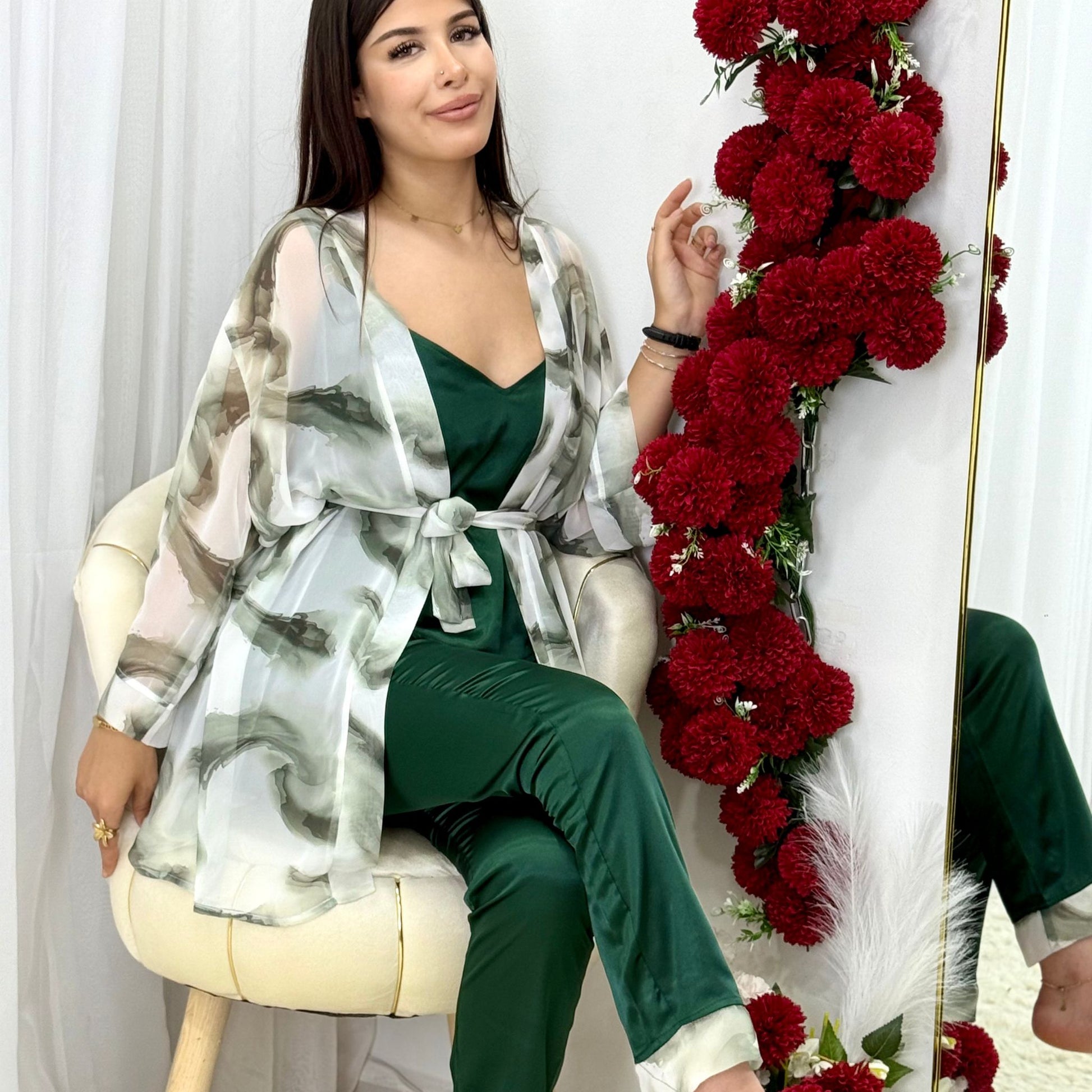 L’ensemble TULIP revient dans une version légère et fluide, pensée pour les journées douces et les soirées estivales. Ce trois-pièces revisité combine un bustier à bretelles fines et un pantalon taille haute en satin européen, le tout sublimé par un kimono aérien en mousseline imprimée. Une rencontre entre raffinement oriental et modernité, pour un confort inégalé et une élégance naturelle.