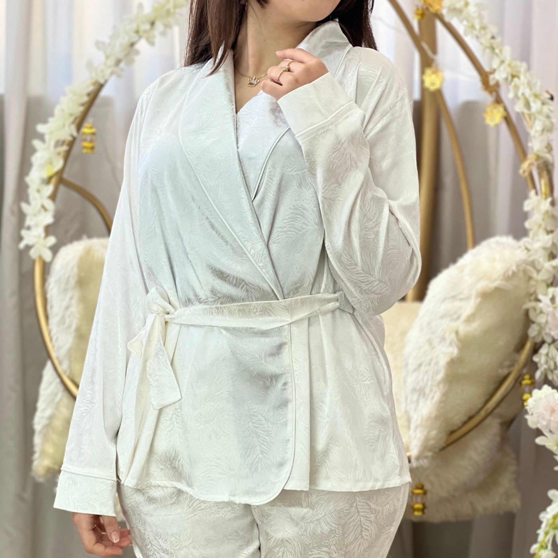 🌸 بيجاما DAUCUS جاكار – إصدار أنيق بخامة ساتان جاكار فاخرة ولمسة نهائية مميزة بشريط باياس.