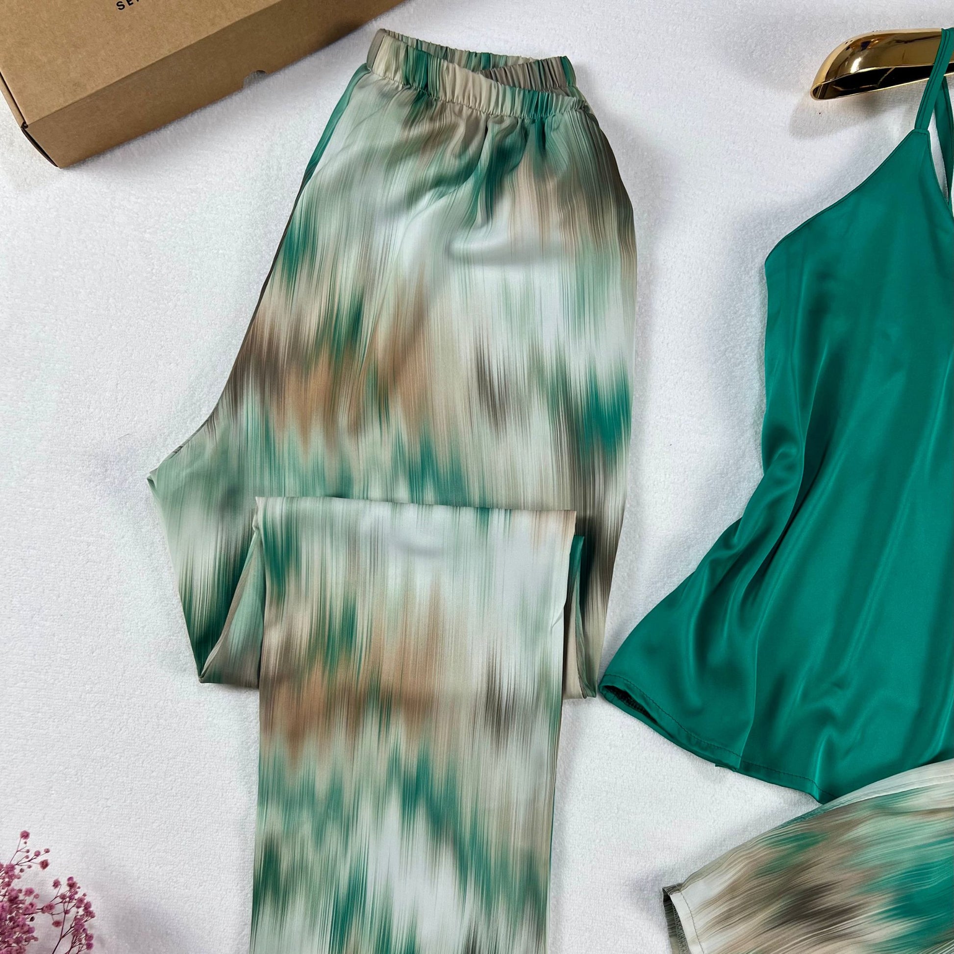 - ✔️ سروال ساتان مطبوع بقصة ضيقة (فوسليه) عالية الخصر مع حزام مطاطي
